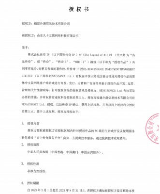 福建uwin电竞信息技术有限公司(以下简称“我司”)经株式会社传奇IP 、RENAISSANCE INVESTMENT ...