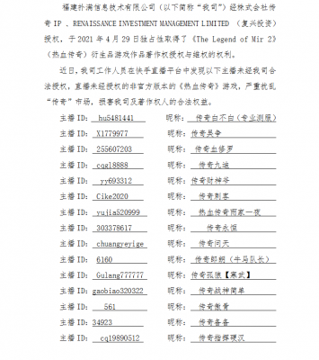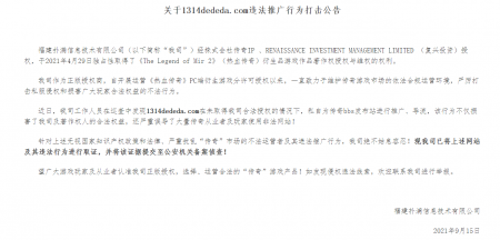 202108-30维权打击公告(二) 福建uwin电竞信息技术有限公司(以下简称“我司”)经株式会社传奇IP 、RENAISSANCE INVESTMENT MANA...