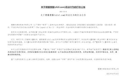 关于搜服搜服(sfsf.com)违法行为的打击公告 福建uwin电竞信息技术有限公司(以下简称“我司”)经株式会社传奇IP 、RENAISSANCE...